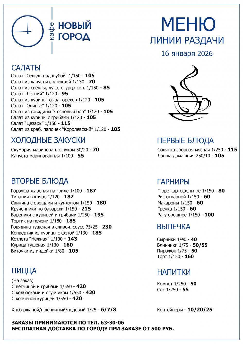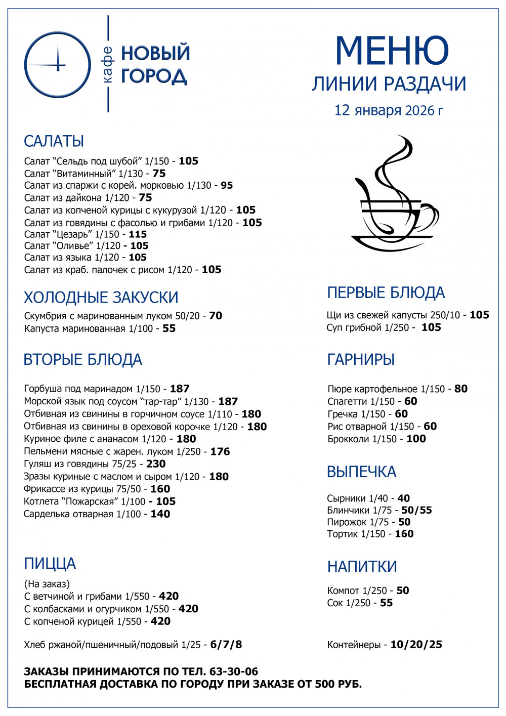 Заказы принимаются с 08.00 - 11.00 текущего дня по телефону 63-30-06